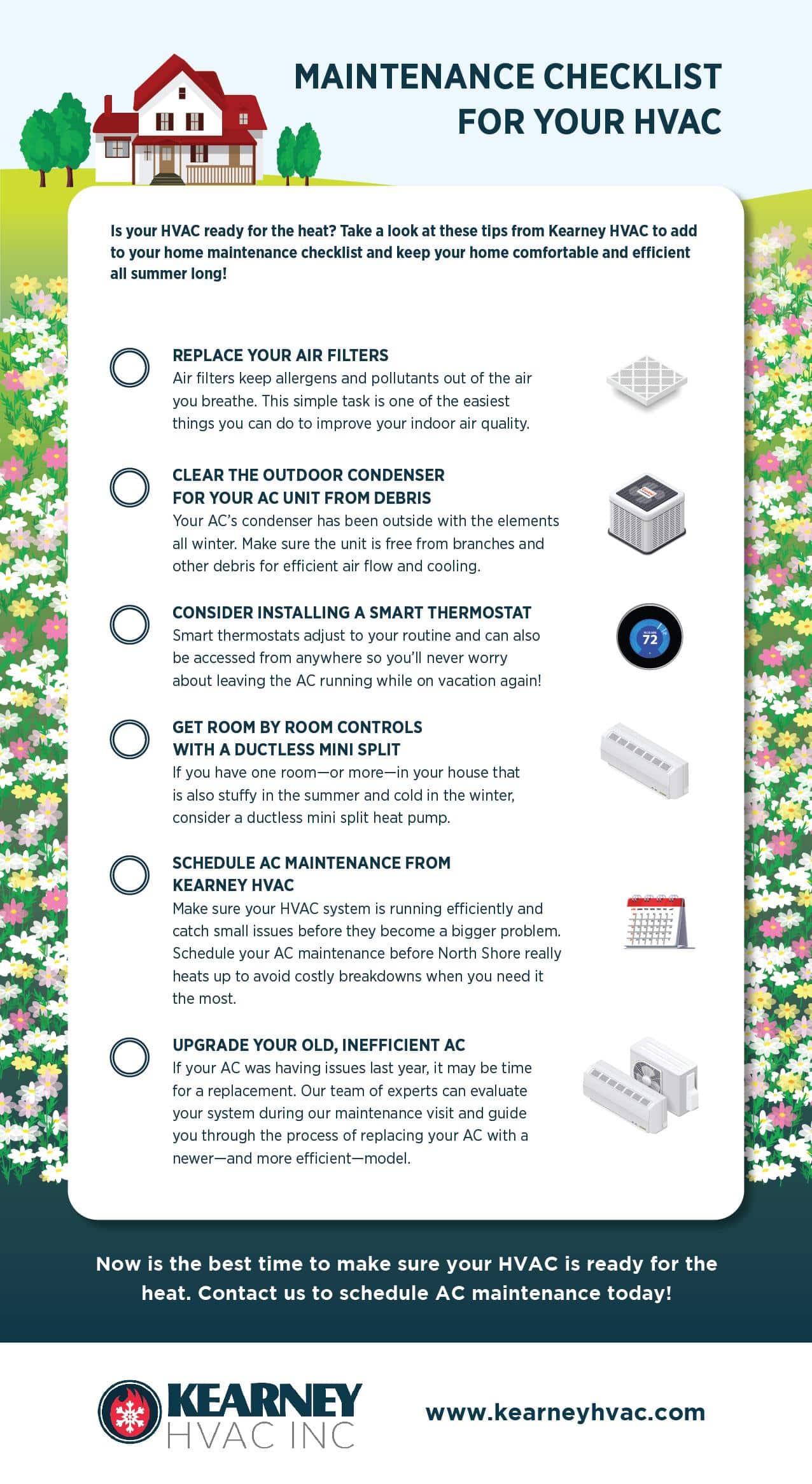- DIY Tasks: Filter replacement, thermostat checks, and clearing debris around outdoor units.